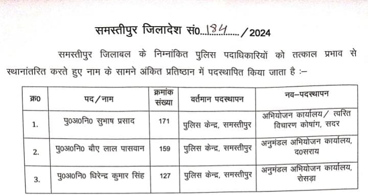 SP विनय तिवारी ने समस्तीपुर जिले के विभिन्न थानो में 82 दारोगा सहित 117 पुलिसकर्मी का किया पिस्टिंग,यहां देखे लिस्ट