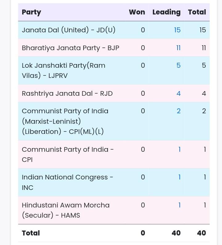 चुनाव आयोग द्वारा दी गई जानकारी के अनुसार बिहार में NDA फिलहाल 34 सीटों पर आगे चल रहा है जबकि ‘INDIA’ 06 सीटों पर लीड कर रहा है। सीटों के मामले में बीजेपी से आगे निकली जेडीयू।