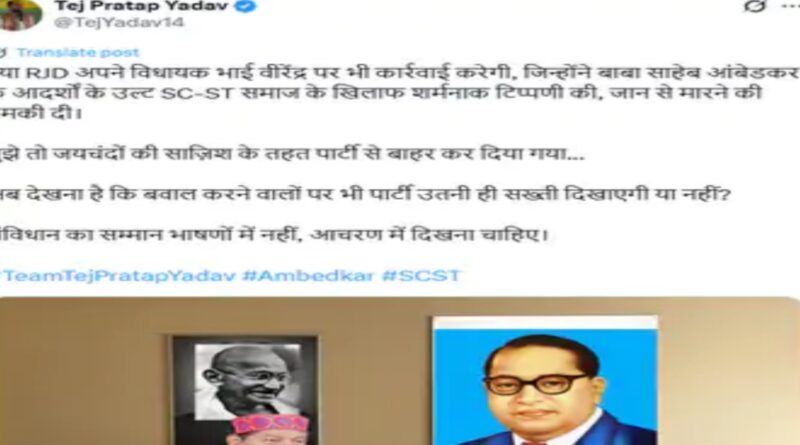 पटना.लालू यादव के बड़े बेटे तेजप्रताप खुलकर राजद का विरोध करने लगे हैं। RJD MLA भाई वीरेंद्र और पंचायत सचिव के बीच हुई बहस और विधायक के जूता मारेंगे वाले बयान पर तेजप्रताप ने पूछा है कि क्या पार्टी इनके खिलाफ कार्रवाई करेगी।अपने सोशल मीडिया हैंडल X पर एक कार्टून शेयर करते हुए सवाल उठाया है कि ‘क्या RJD अपने विधायक भाई वीरेंद्र पर भी कार्रवाई करेगी, जिन्होंने बाबा साहेब अंबेडकर के आदर्शों के उल्ट SC-ST समाज के खिलाफ शर्मनाक टिप्पणी की, जान से मारने की धमकी दी।’