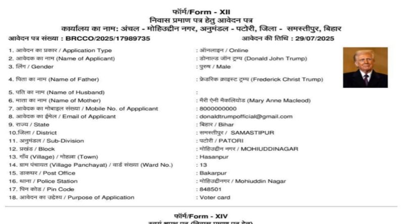 आवेदन में अमेरिकी राष्ट्रपति डोनाल्ड जॉन ट्रम्प का फोटो लगाया गया है, वहीं आवेदन में उनके पिता का नाम फ्रेडरिक क्राइस्ट ट्रम्प तथा माता का नाम मैरी एनी मैकलियोड अंकित है. वहीं मोबाइल नंबर- 8000000000 अंकित है. पता में अनुमंडल पटोरी, प्रखंड मोहिउद्दीननगर, गांव हसनपुर, वार्ड संख्या-13, डाकरघर बकरपुर, थाना- मोहिउद्दीननगर तथा पिनकोड- 848501 दर्ज है. वहीं निवास प्रमाण पत्र बनवाने के उद्देश्य में वोटर कार्ड अंकित किया गया है. निवास प्रमाण पत्र के लिये आवेदन 29 जुलाई 2025 को किया गया है. दिये गये आवेदन की जांच के दौरान पता चला कि निवास प्रमाण पत्र के आवेदन के फोटो, आधार संख्या, बार कोड तथा पता से छेड़छाड़ किया गया है. जांच के बाद राजस्व अधिकारी श्रृष्टि सागर के द्वारा 4 अगस्त 2025 को आवदेन को अस्वीकृत कर दिया गया. मामला मोहिउद्दीननगर बीडीओ व सीओ के भी संज्ञान में गया. अधिकारियों ने इसे गंभीरता से लिया है.