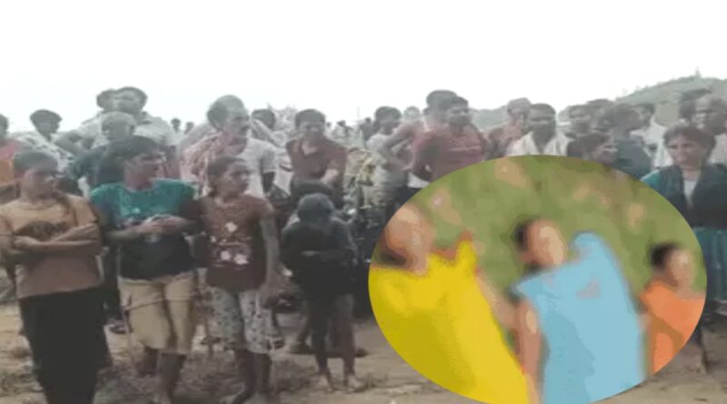 बच्चों की मौत के बाद गड्ढे के पास जुटी लोगों की भीड़।